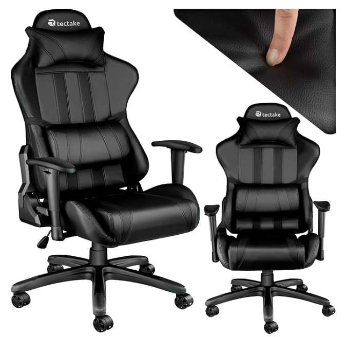 Silla Gaming de Escritorio, Silla de Oficina Ajustable, Sillón Gaming con Respaldo Reclinable, Silla Ergonómica con Reposabrazos y Cojín Lumbar, Piel Sintética, Color Negro
