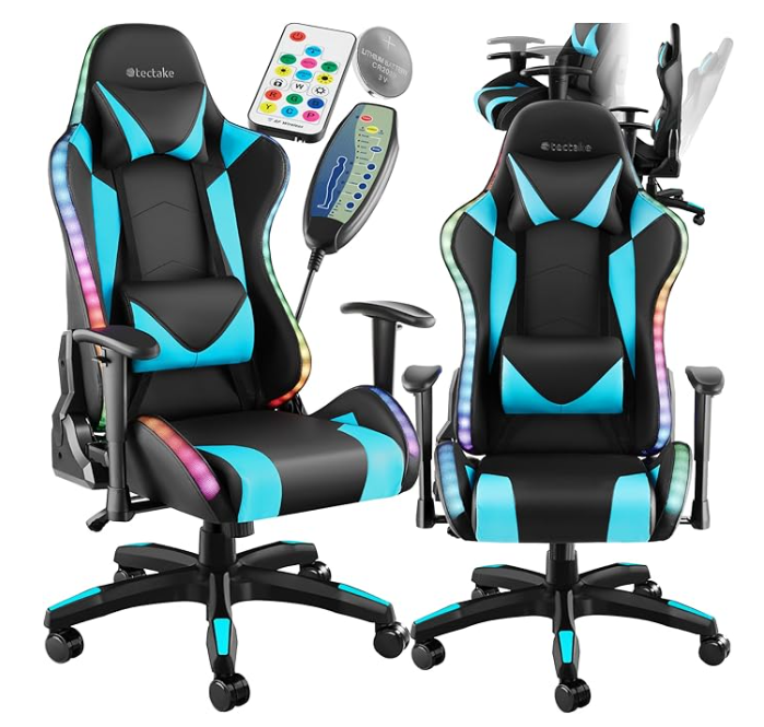 Silla de Oficina Ergonómica con Función Masaje, Iluminación LED, Respaldo y Reposabrazos Ajustables, Silla Giratoria Reclinable, Silla para Escritorio y Gaming, Color Negro y Celeste