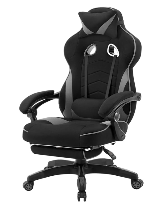 Silla Gaming en Tela Transpirable, Ergonómica Silla Gamer con Reposapiés, Sillón Giratorio Videojuegos, Silla Oficina con Asiento Ancho y Cómodo para Personas Grandes, Color Negro con Gris