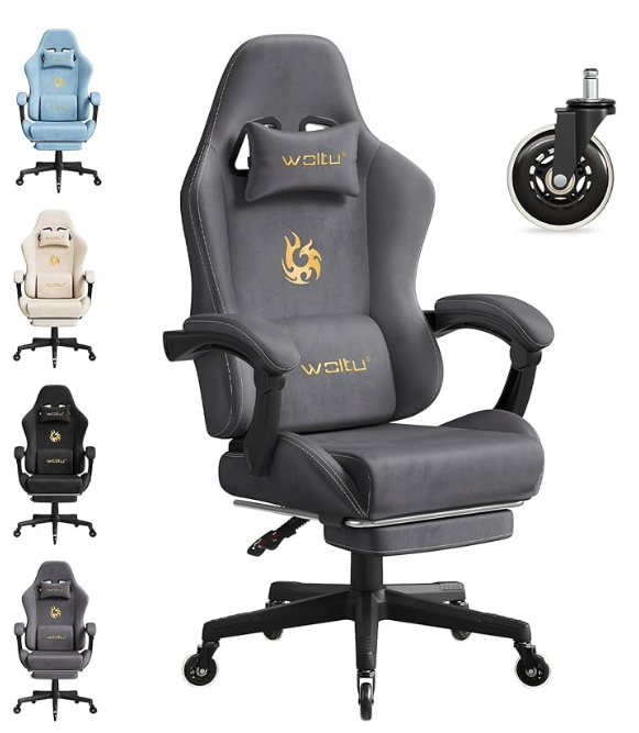 Silla Gaming con Soporte Lumbar, Silla Oficina Ergonómica con Cabeza y Reposapiés, Sillón Trabajo Giratorio con Gran Asiento y Ruedas, Tela de Ante, Color Gris